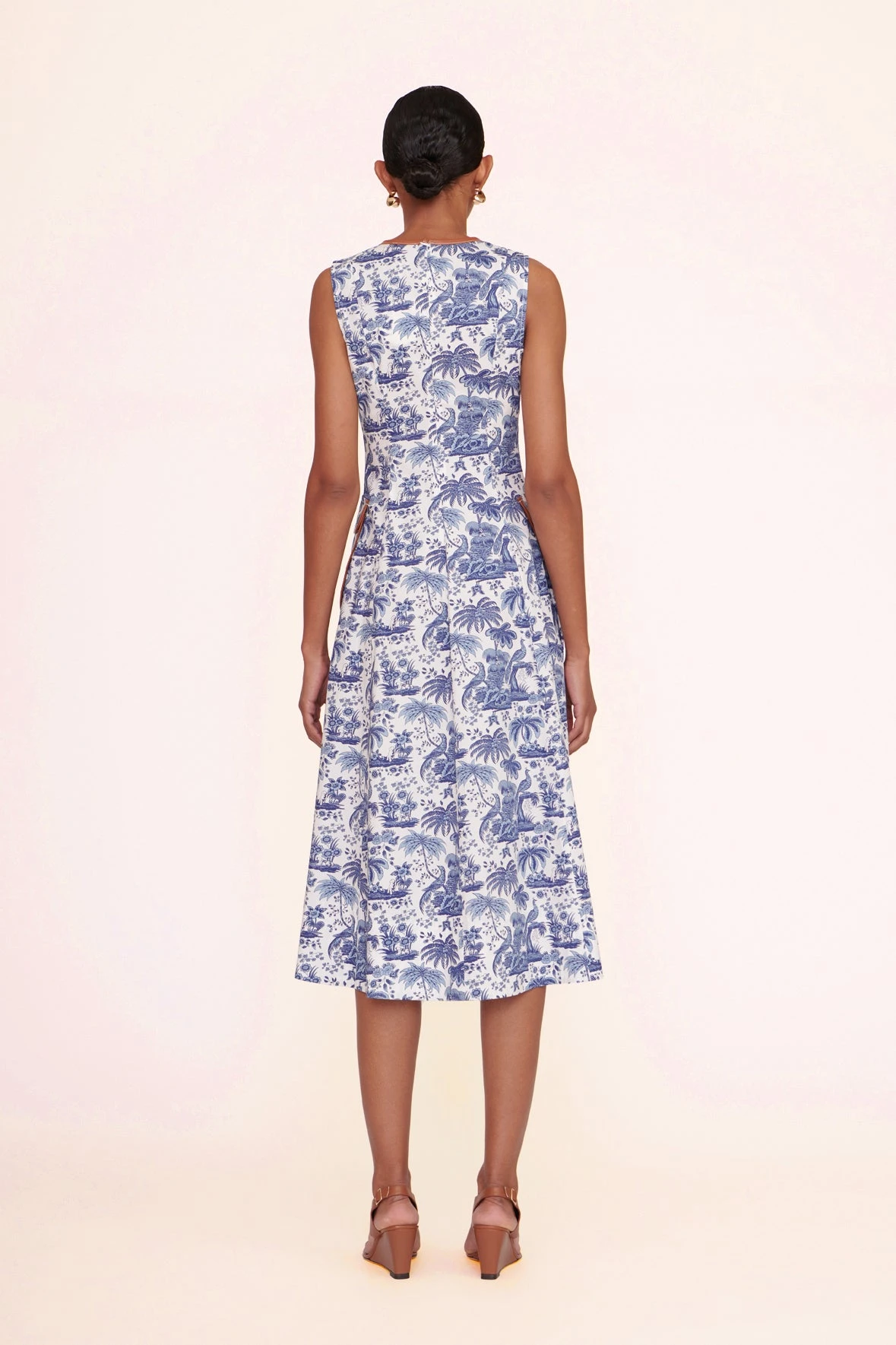 The Bait Dress is a midi-length toile poplin dress featuring two vegan leather trimmed front pockets. Sleeveless with a high neckline, fitted bodice, and flared skirt; this is a great transitional piece for day-to-night.