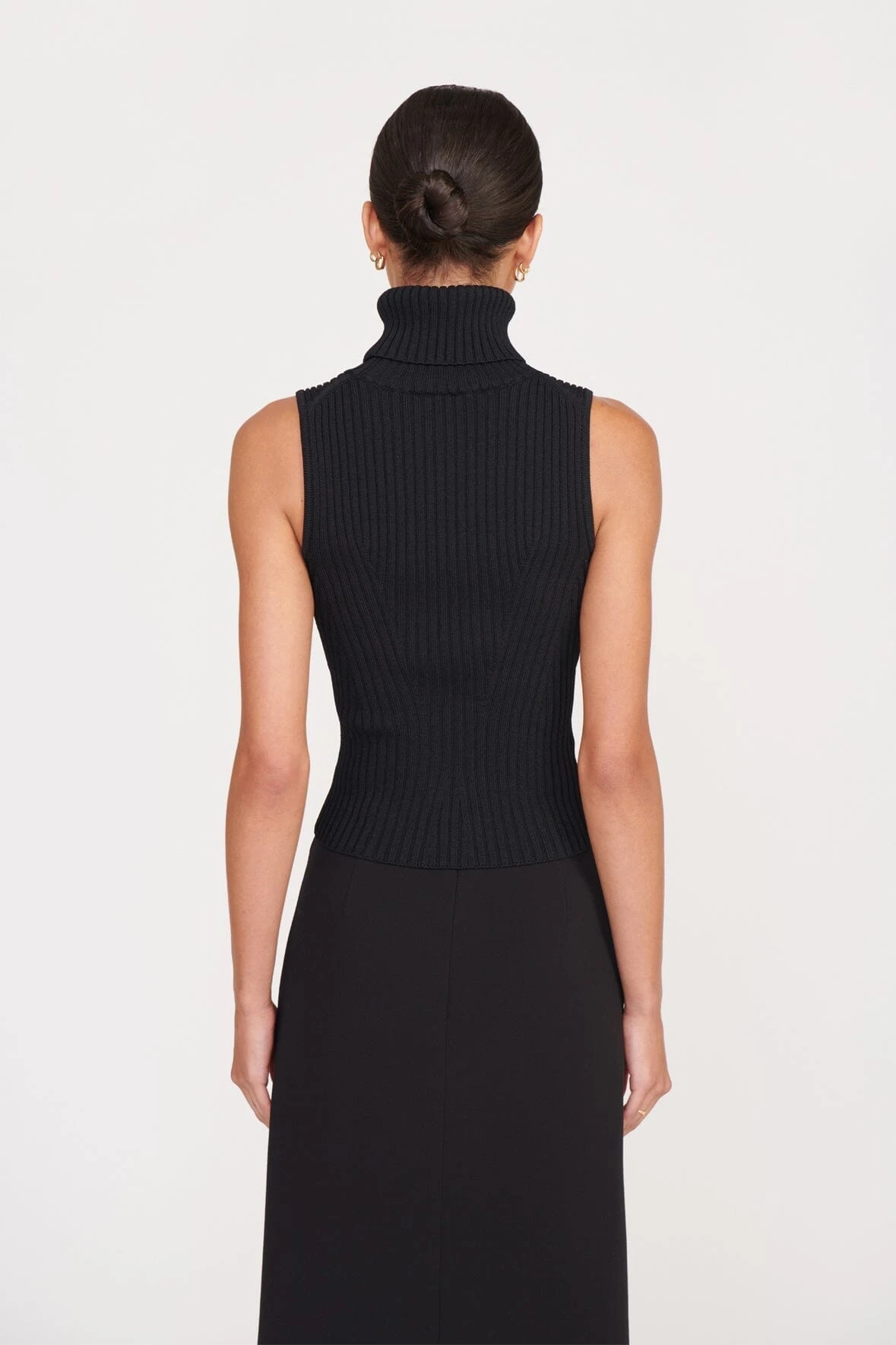 A sleeveless turtleneck top made out of a stretchy rib knit fabric. This style offers a fitted silhouette and full fashioning pattern throughout.ย