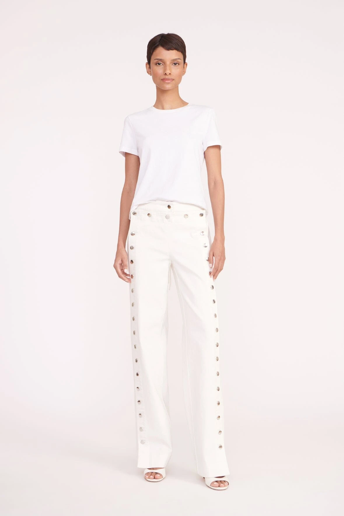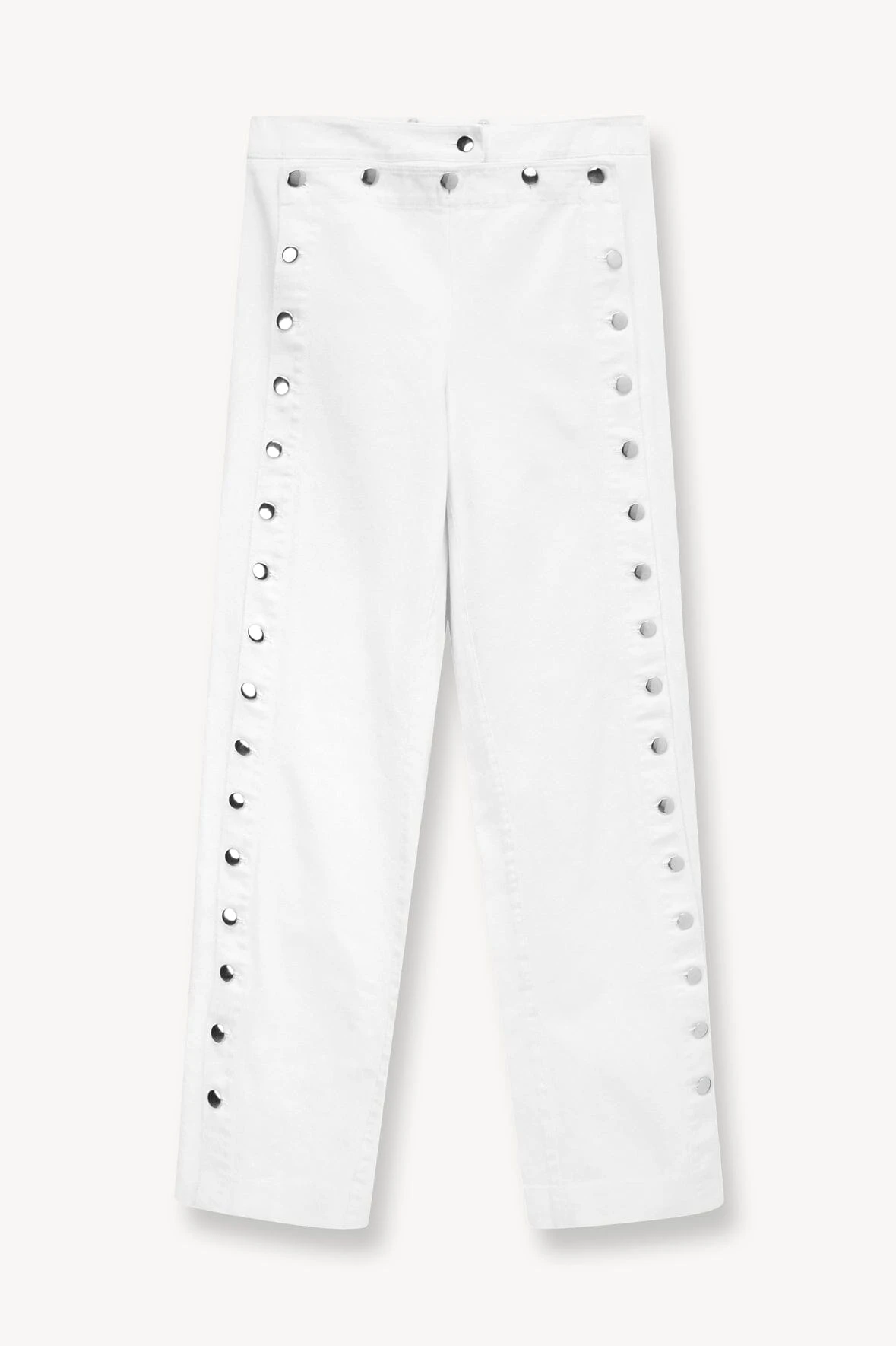 A straight leg pant made out of white denim, the Carter features a sailor flap front closure and contrasting button detail down the leg.