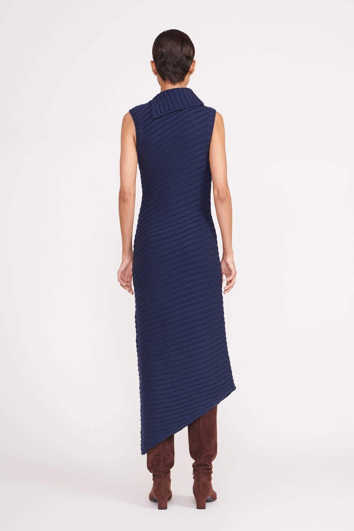 The Cary Dress is a chunky asymmetrical sweater midi dress in merino wool. This style features a diagonal rib stitching and an asymmetrical turtleneck collar and hem.ย
