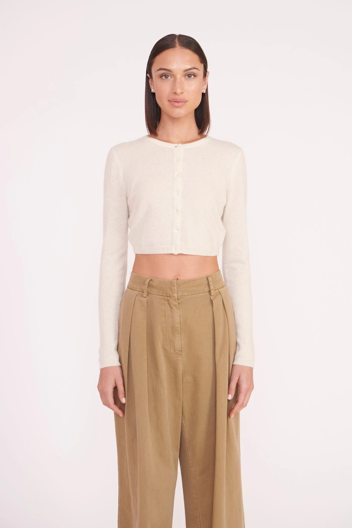 The Deanna Sweater is a cropped cashmere cardigan, a perfect layering piece for the season. The cardigan features a crewneck and button detail.ย