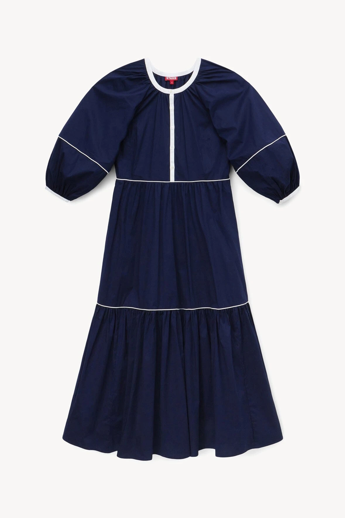 The Demi Dress is a three quarter sleeved maxi dress featuring contrasting trim, a button front, and tiered skirt.