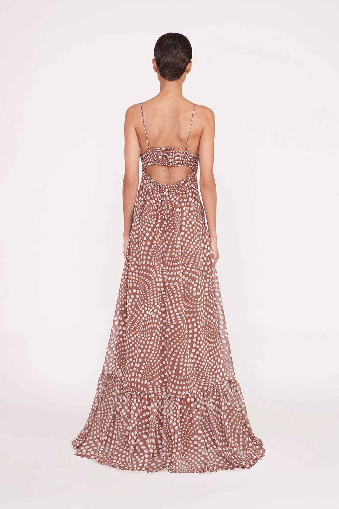A full length gown constructed out of a printed crinkle chiffon fabric, the Florence Dress offers a fitted empire waistline and flowwy skirt. This style features a peplum hem and spaghetti straps which tie at the back.ย