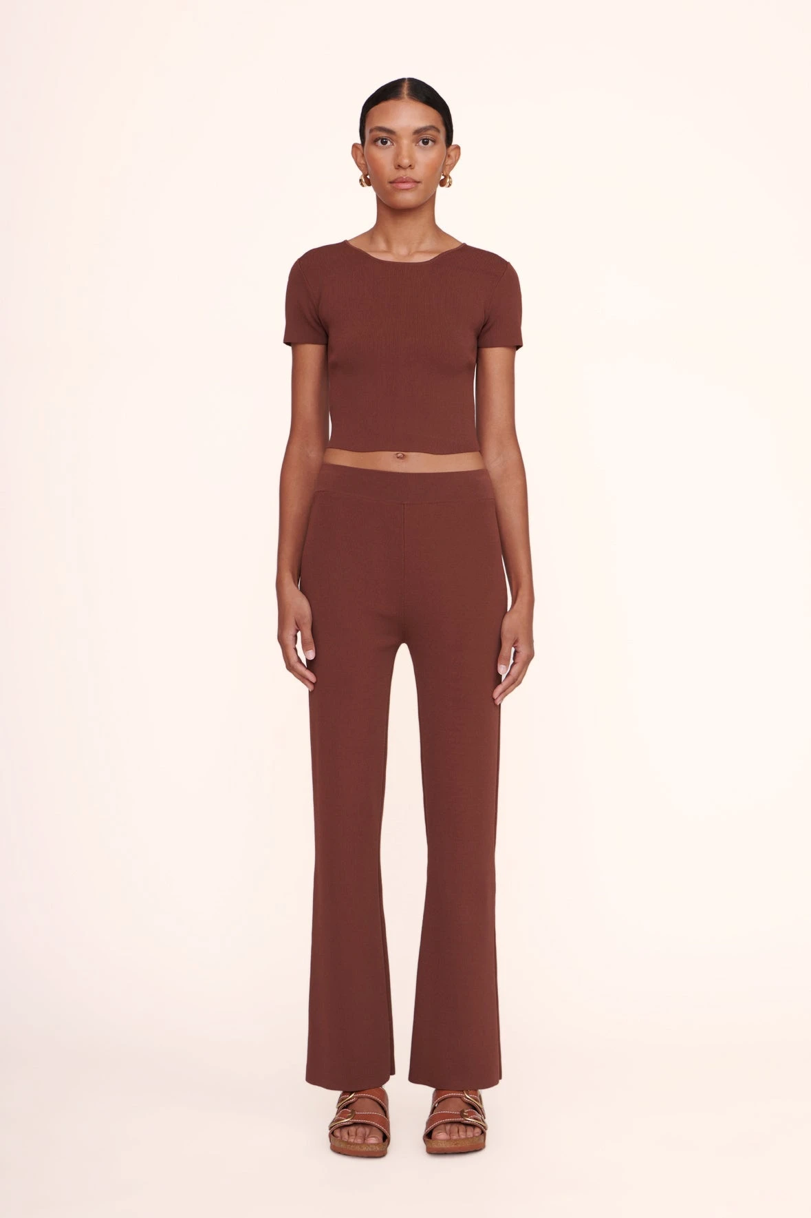 The Ila top is a cropped knit short sleeve tee shirt. A closet staple, pair back with any of our pants for an effortless look.