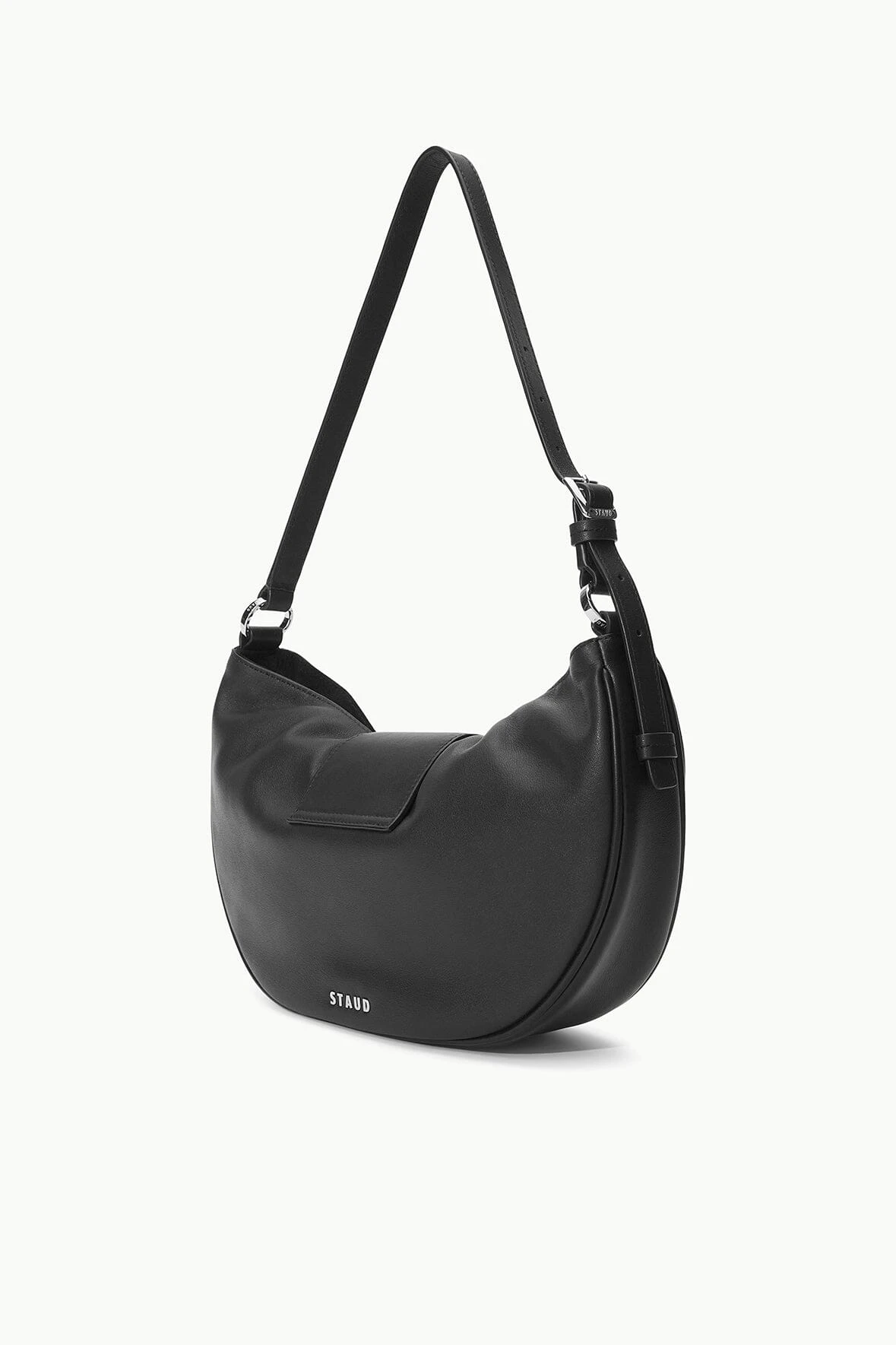 A soft, crescent-shaped shoulder bag with pushlock closure detail. The Marike Bag features an adjustable shoulder strap offering versatility in wearing long or short.