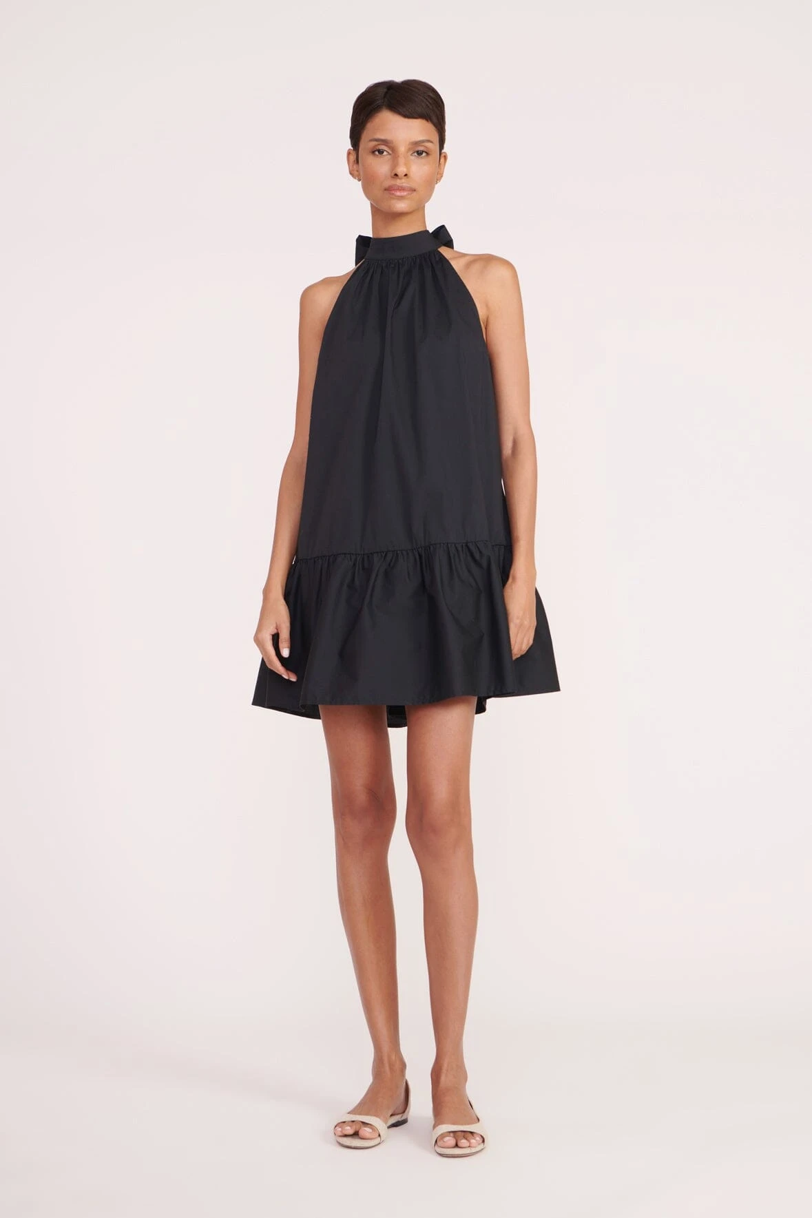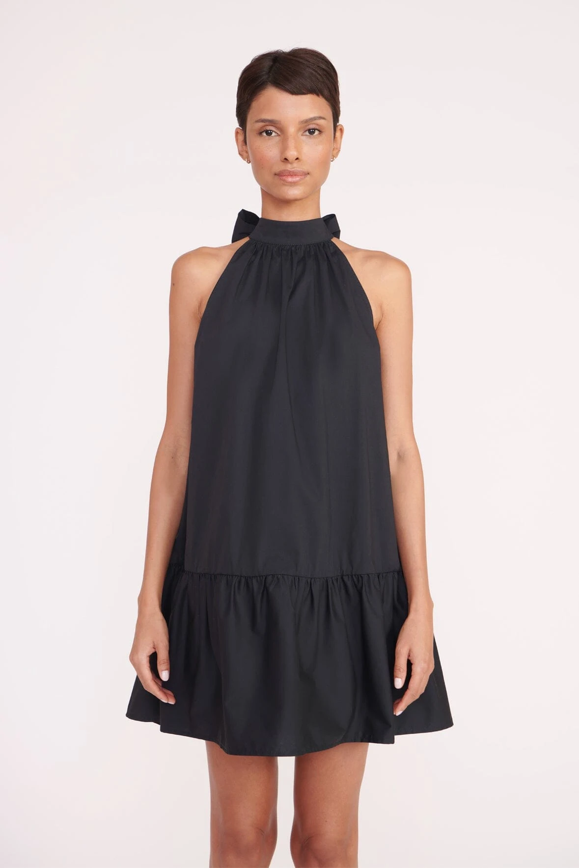 An easy a-line mini dress constructed out of cotton poplin, the Marlowe features a neck tie detail and peplum hem.
