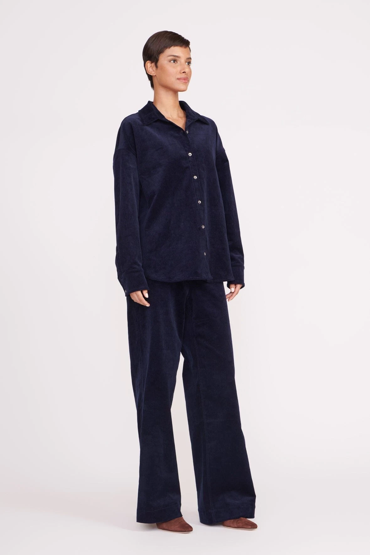 The Matthew Shirt is an oversized button-up shirt in our seasonal corduroy. Wear it open with our Woodgrain Top or closed for a tailored look.