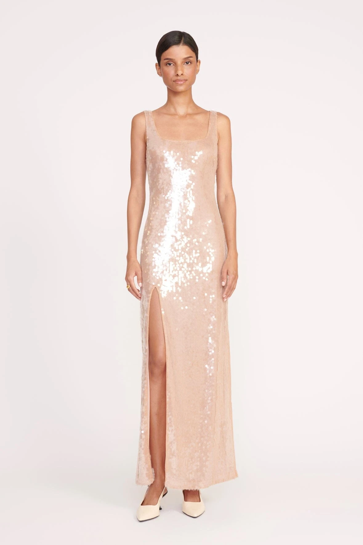 The full-length update to our favorite Le Sable Dress, The Maxi Le Sable is a full length cocktail dress embellished with shiny paillettes. This style features bra-friendly straps, a hidden back zipper, and a thigh high slit.