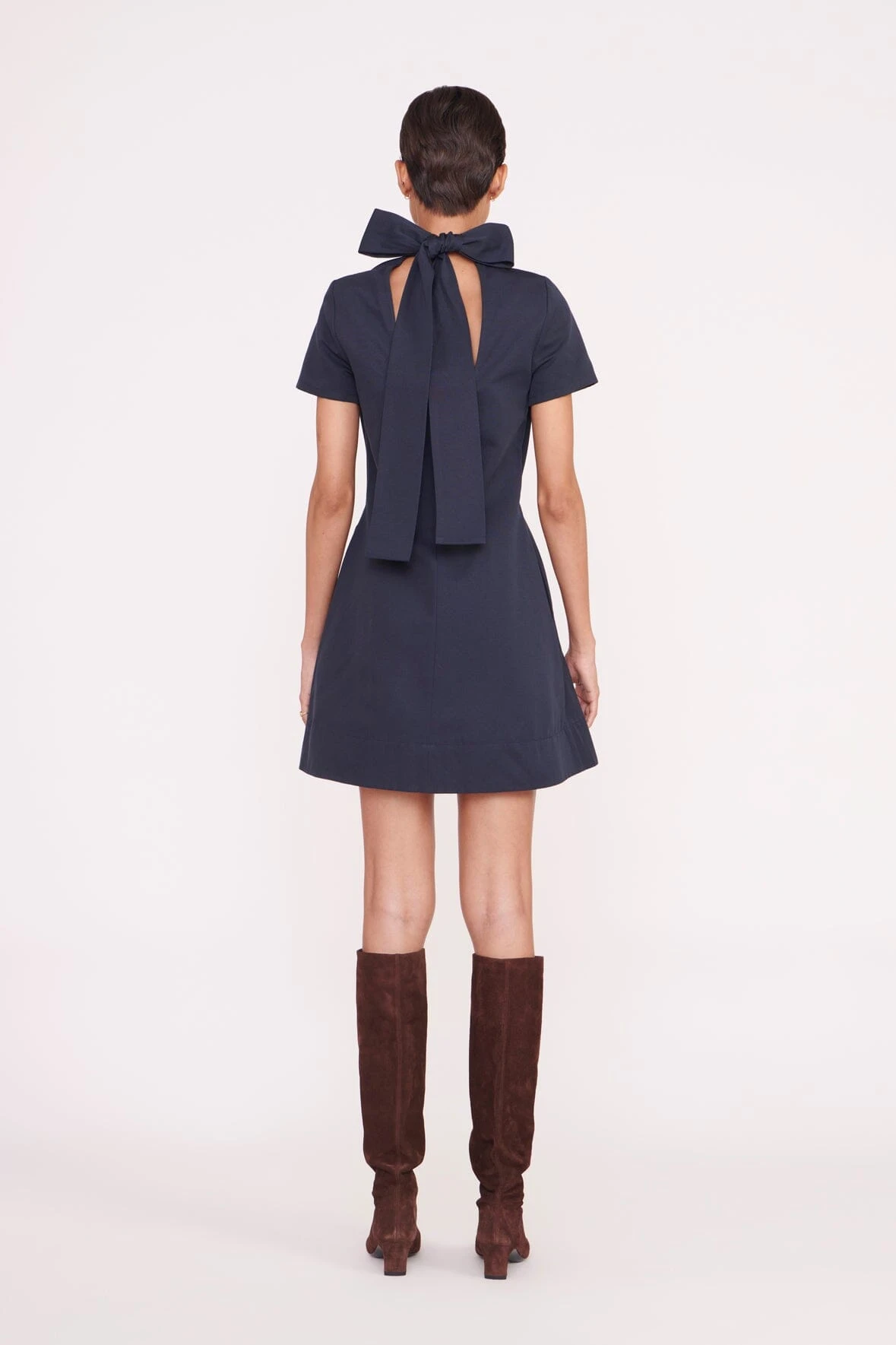 The Mini Ilana is a high neck mini dress with a scoop back and functional, self-tie bow collar. Constructed out of grosgrain fabric, this dress is the perfect statement piece for any occasion.