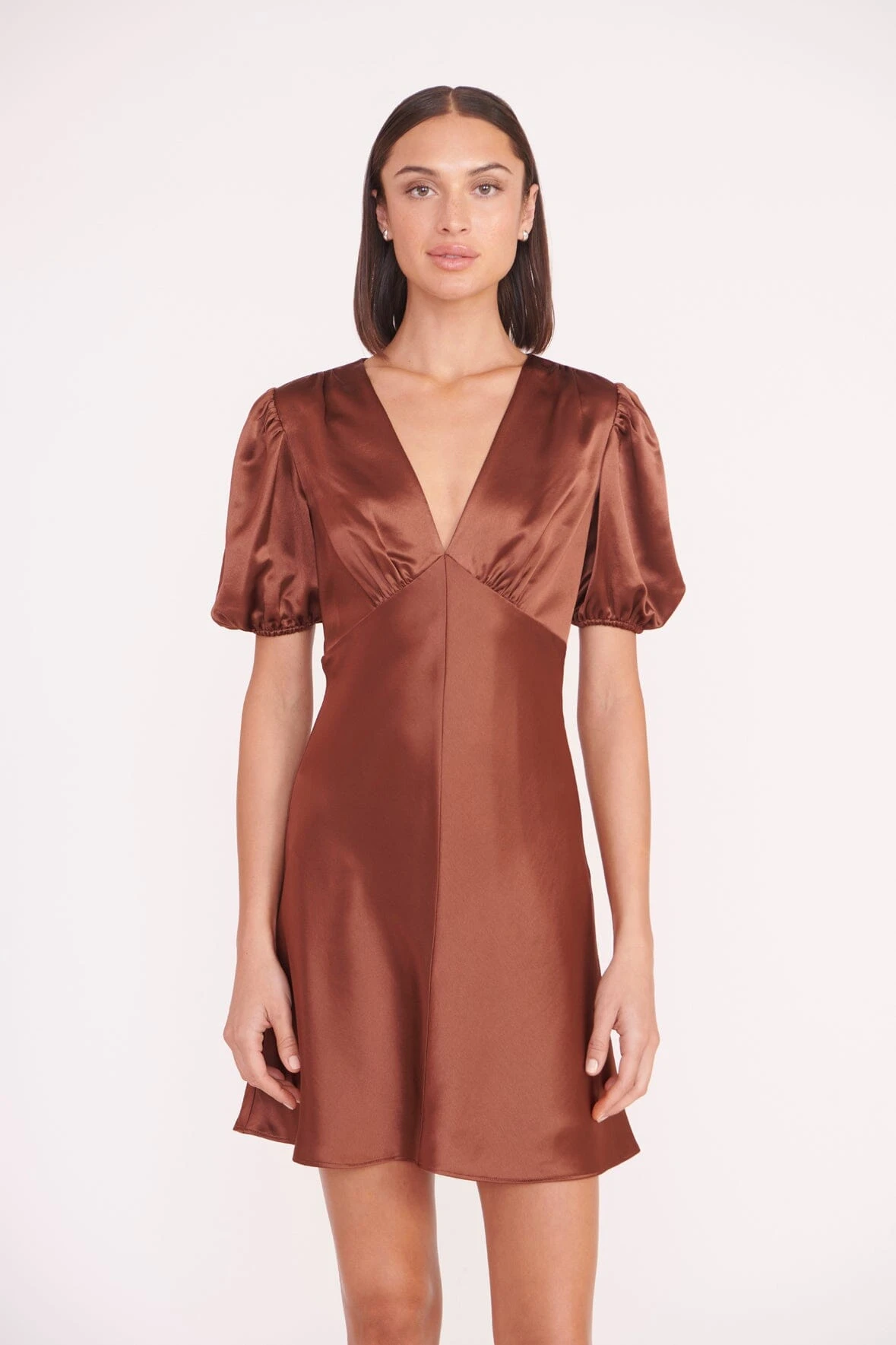 A short sleeve mini crafted from a drapey satin fabric, the Mini MIlla features a v neck and empire waistline. This seasonal update in satin has a hidden zipper closure at the side.