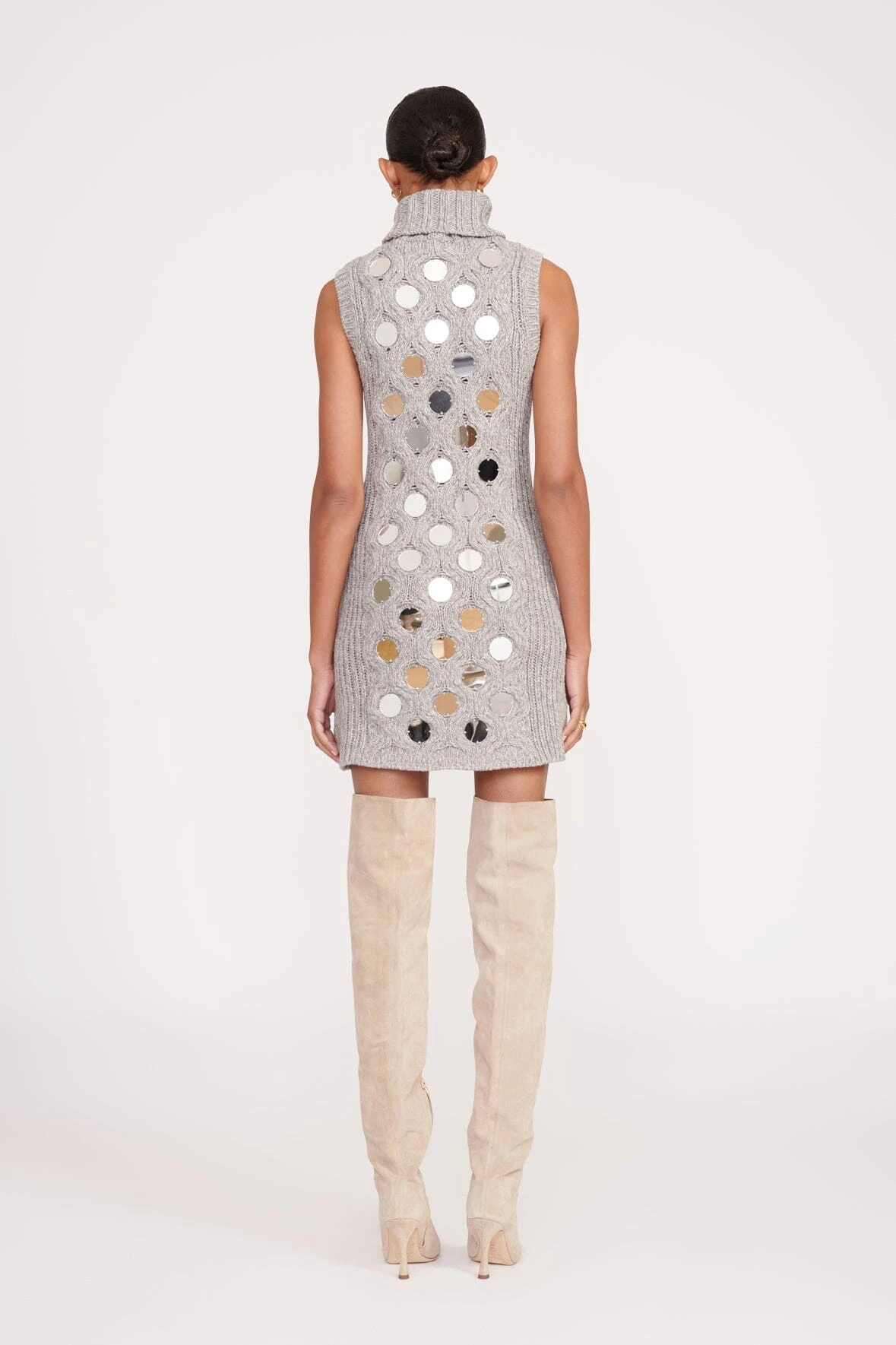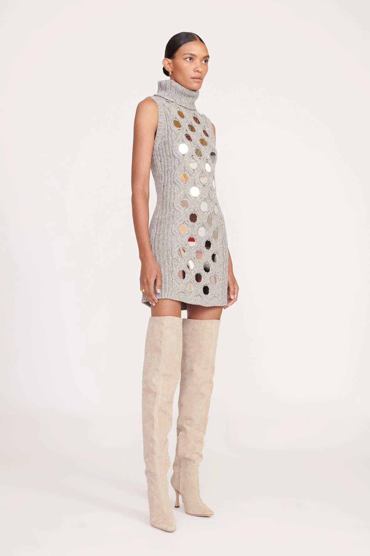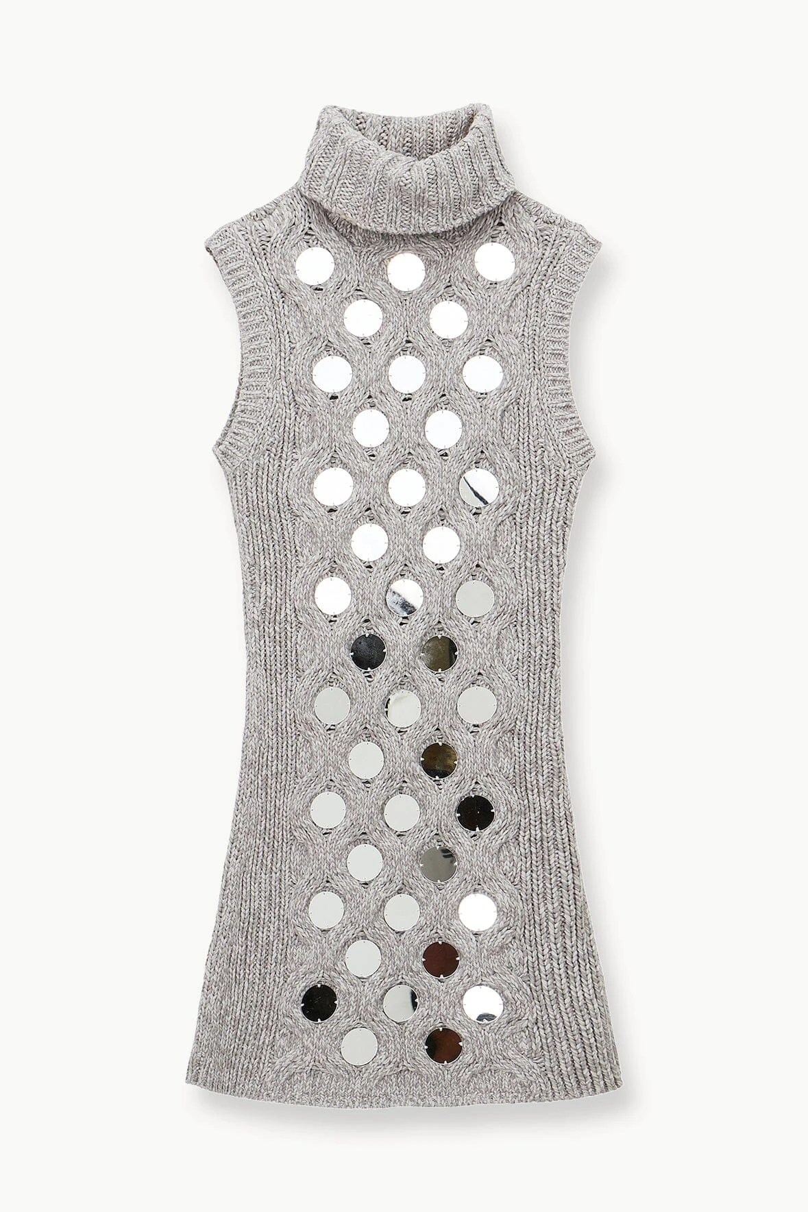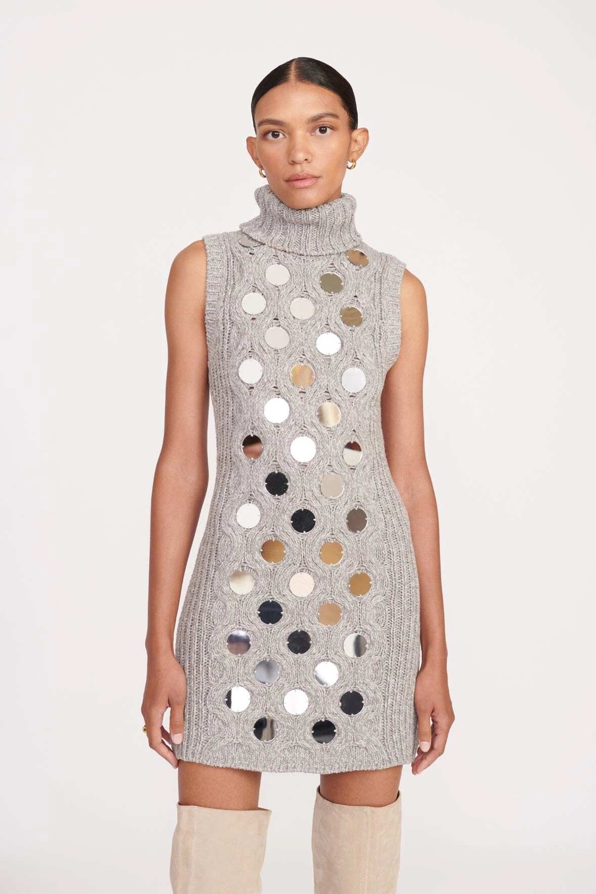 A mini sweater dress in a honeycomb cable knit with mirrored paillettes, the Mod Dress is the perfect dress to layer under a coat with knee-high boots. The Mod Dress features a turtleneck and a sleeveless body.ย