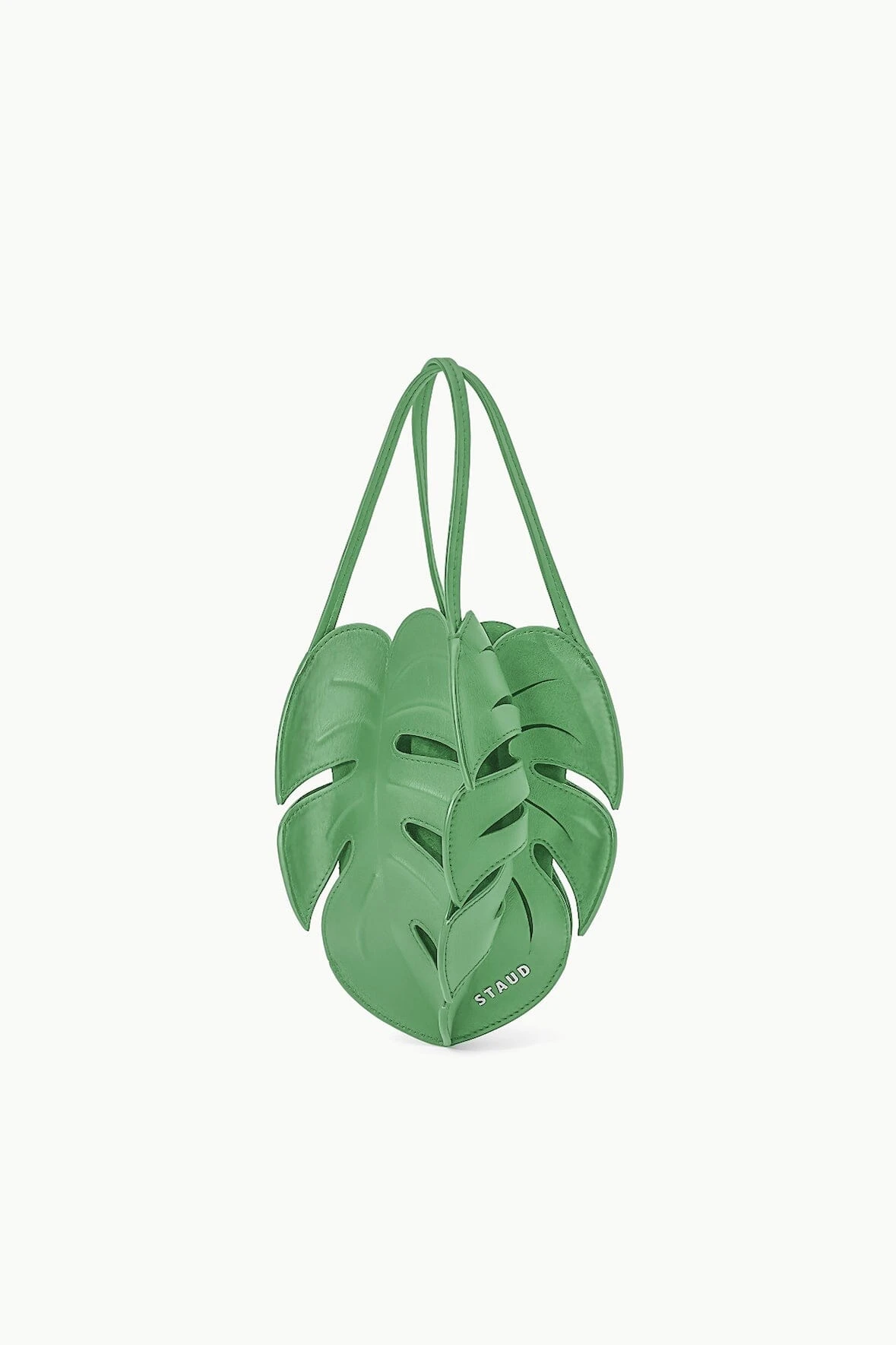 A handheld leather bag constructed of four leaf-shaped panels. The Palm Bag features two handheld straps and a magnetic closure.Â