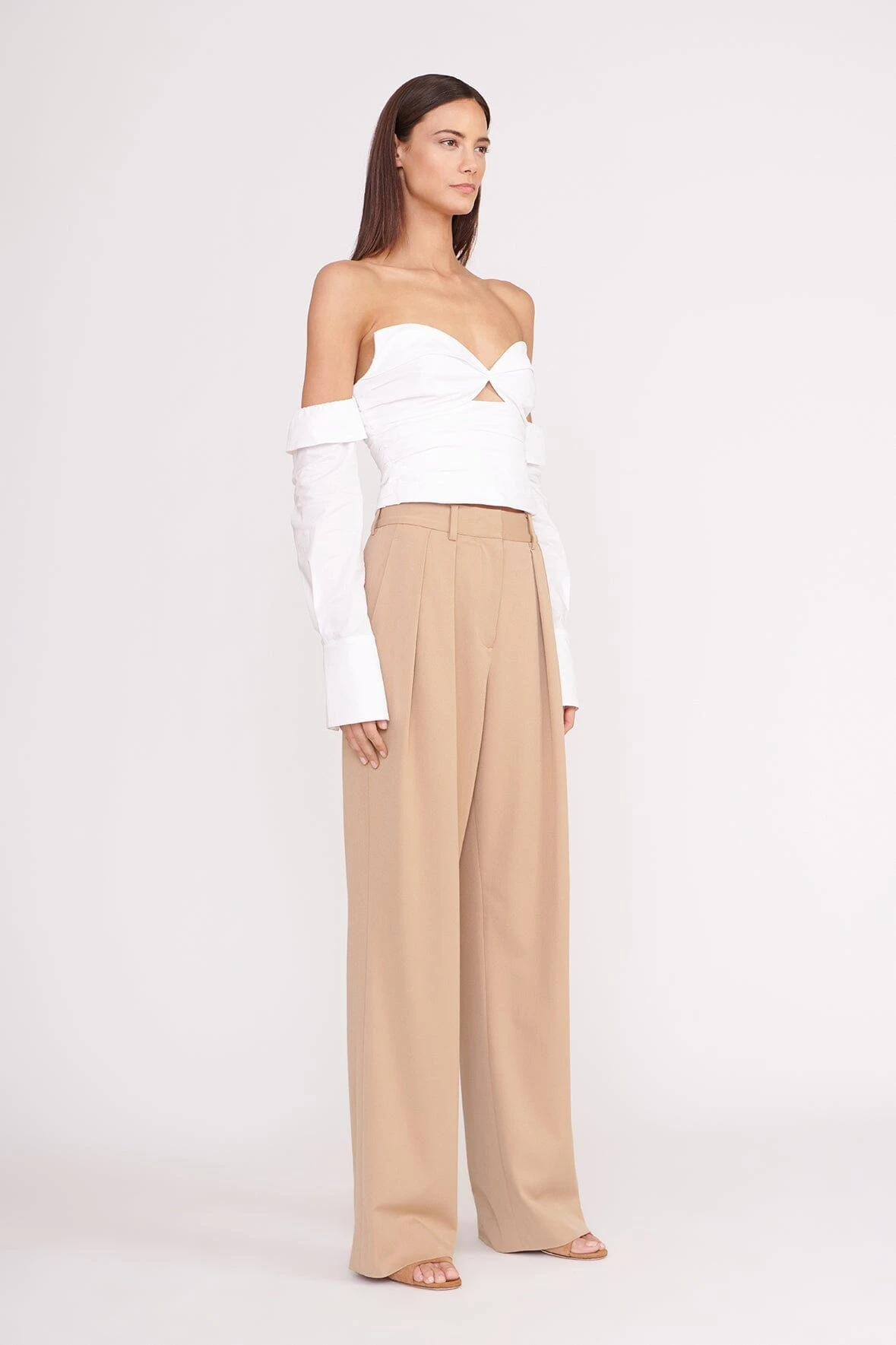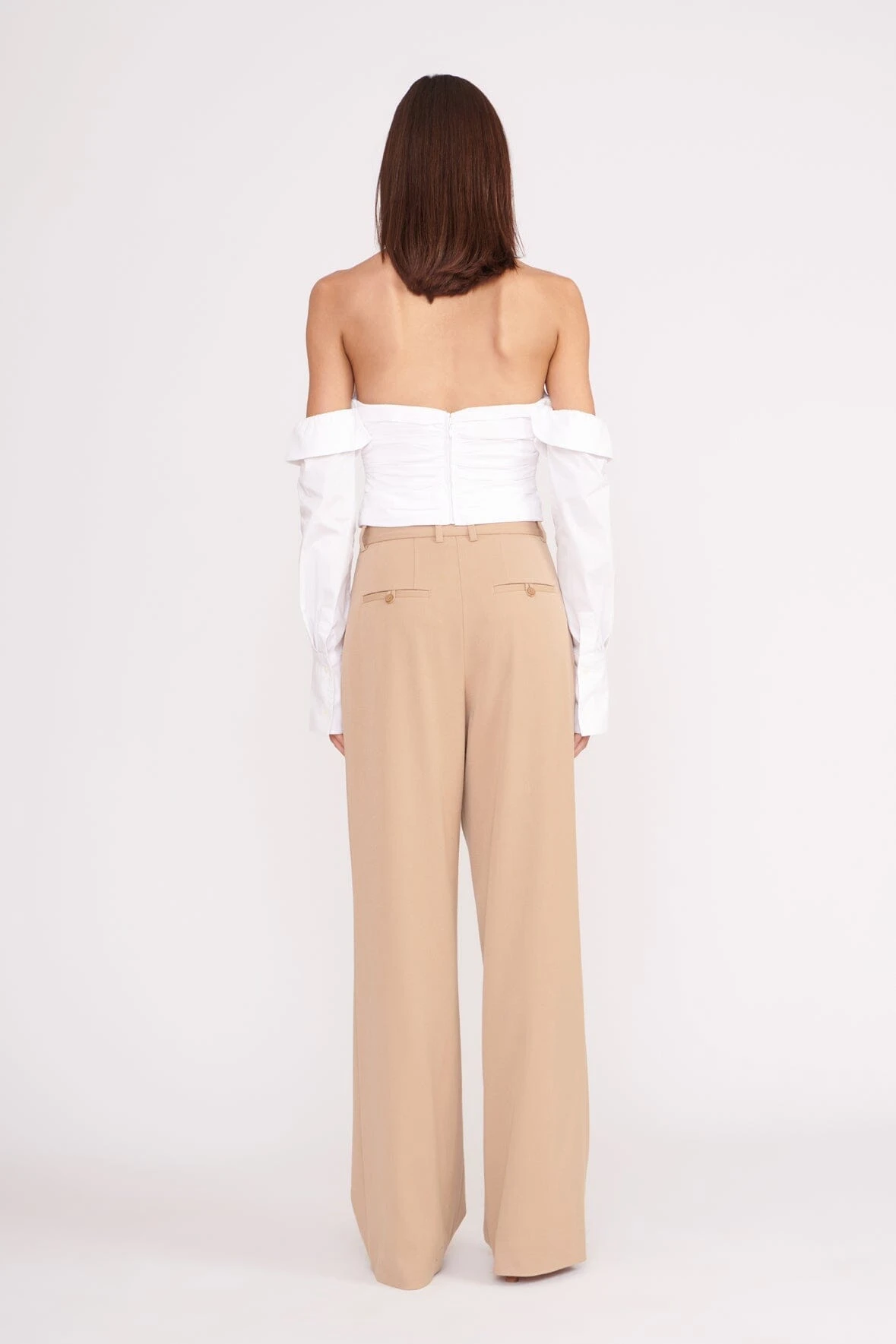 A strapless corset top made out of our slightly stretchy cotton poplin fabric. This style features fully removable sleeves, pointed cup details and a gathered bodice.Â