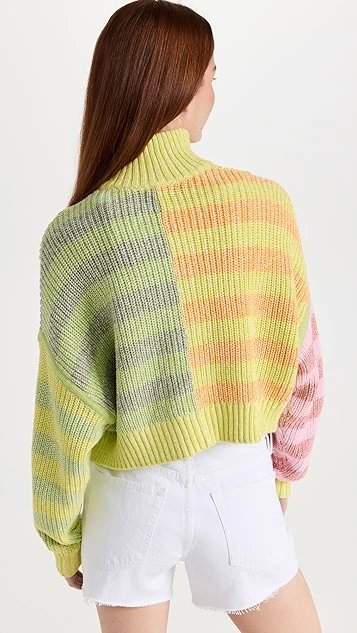 A charming piece of knitwear for transitional weather. This STAUD sweater cuts a unique silhouette, thanks to a slouchy drape, a half zip neckline, and an asymmetrical mix of light-colored stripes. Shorts and jeans will both work equally well with this piece.