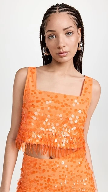 A smattering of sequins covers the entirety and hangs past the hem of this bright orange STAUD crop top. For a special-occasion look that’s sure to steal the show, add the label’s matching miniskirt to the mix.
