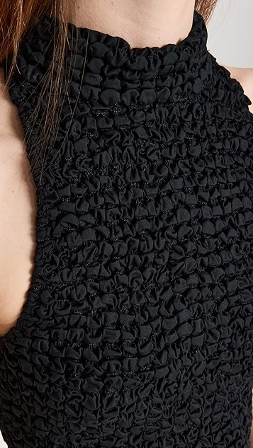 - Halter neckline and smocked elastic body