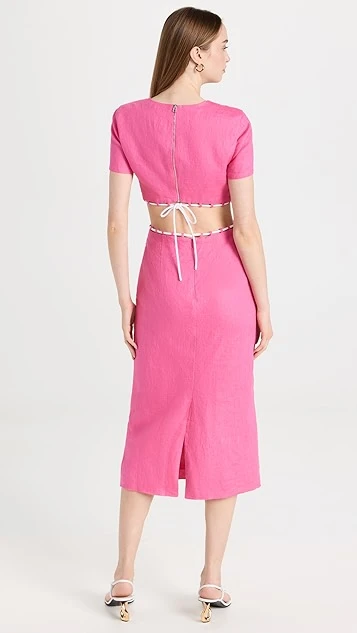 Pink linen composes this sleek and unique STAUD dress, which is accented with contrast cords that accentuate its cutout waist. Wear yours with a pair of heeled sandals from the label’s collection.