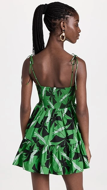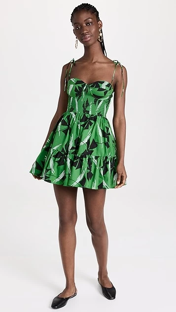 This vividly patterned STAUD mini dress juxtaposes a formfitting bustier bodice with a flared skirt for a classic fit and flare look. Wear yours with a dark pair of kitten heels, and accessorize with gold-tone jewelry.