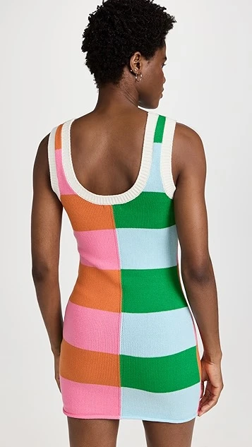 Featuring a bold, colorblocked mix of stripes, this figure-skimming STAUD mini dress won’t fail to draw the eye. Contrast trim outlines the sporty scoop neckline. This piece will work well with all sorts of footwear choices, from heeled sandals to everyday-friendly slides.