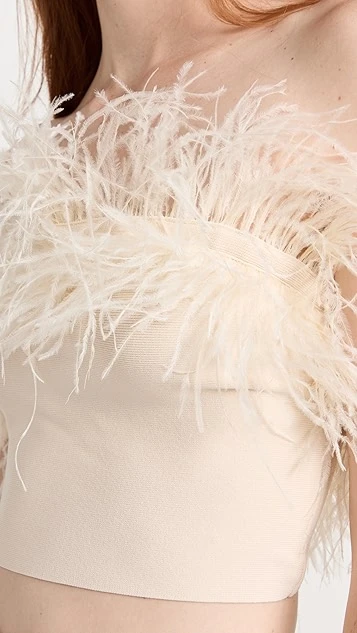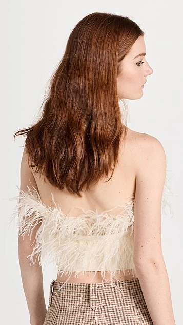 A classic tube top with a glamorous makeover, this eye-catching STAUD Nellie top combines a neutral shade with voluminous tufts of ostrich feathers. Wear yours with the tailored trousers of your choice, and accessorize with hoop earrings.