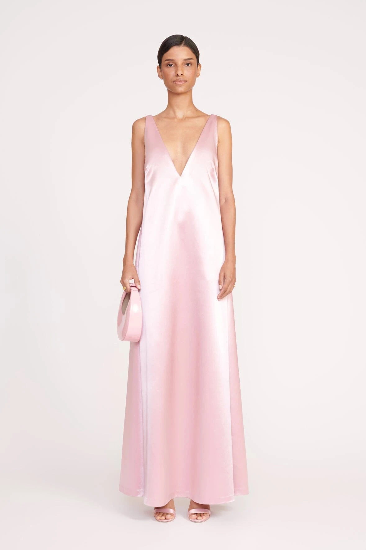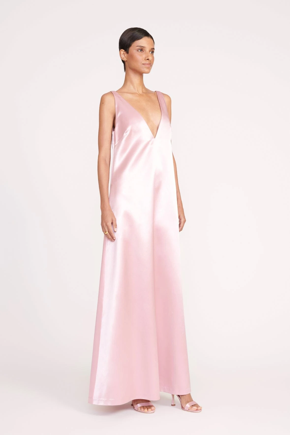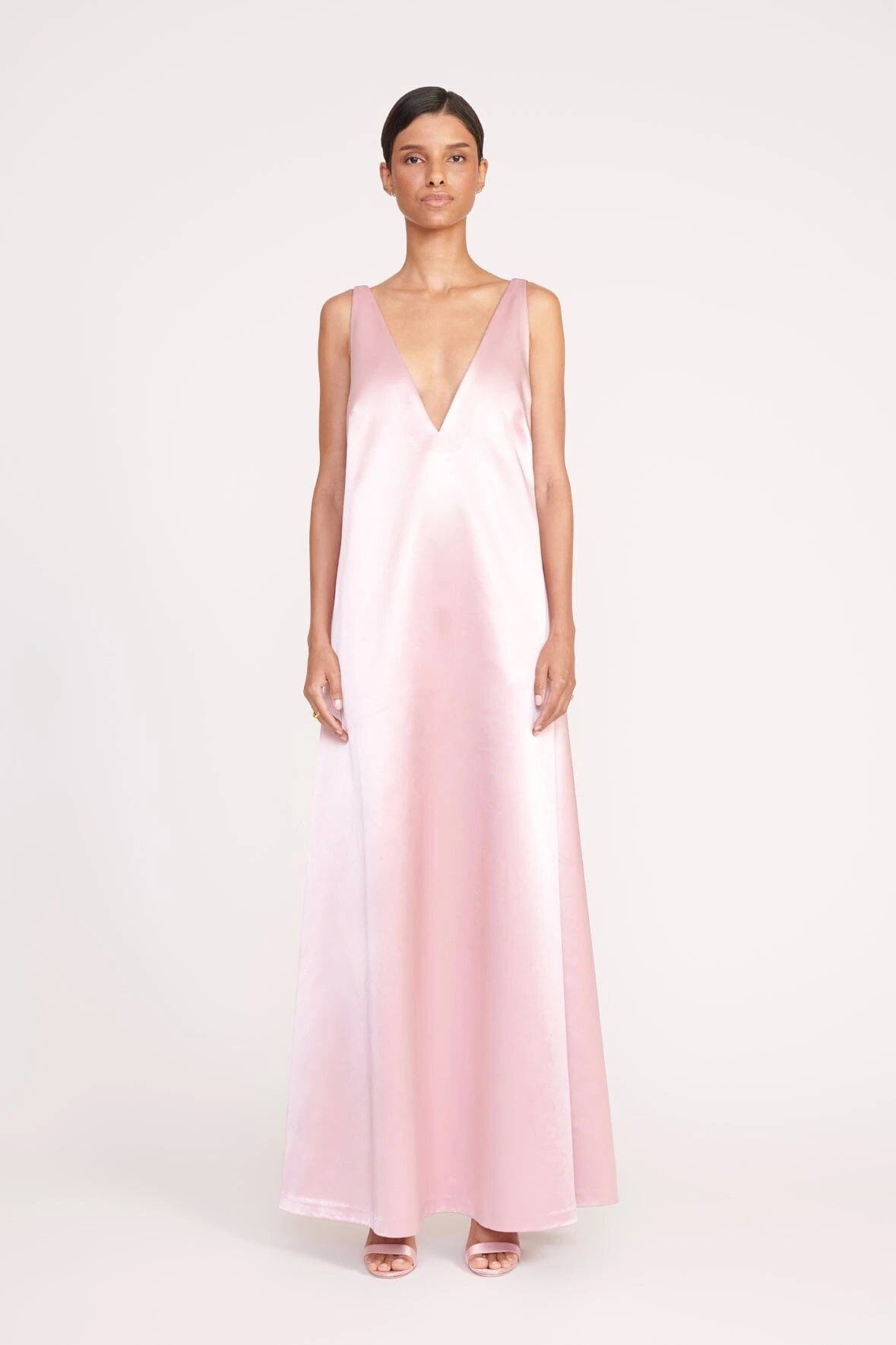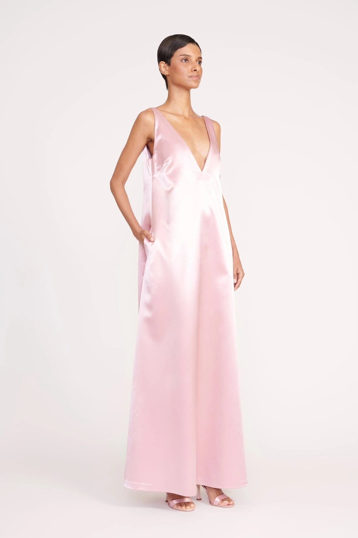 A maxi-length gown constructed out of a heavy satin fabric, the Teagan Dress features a deep v neckline andย side pockets.