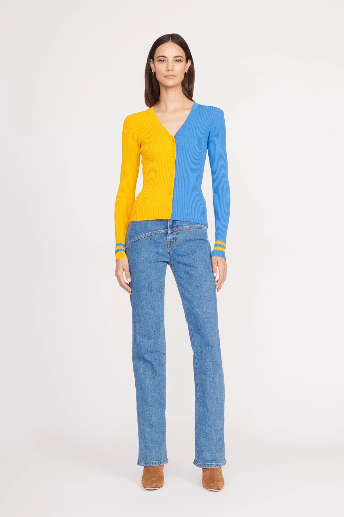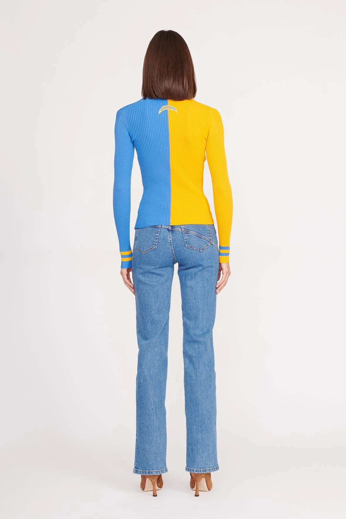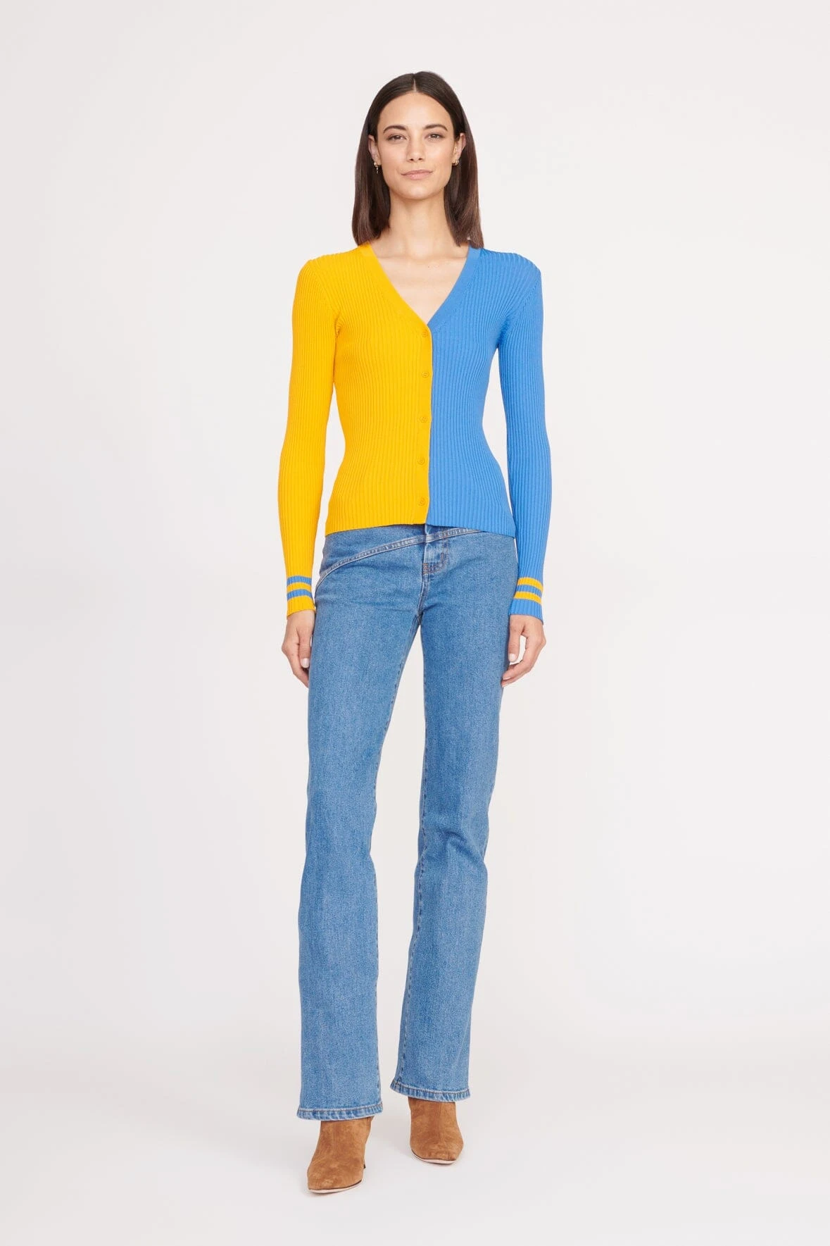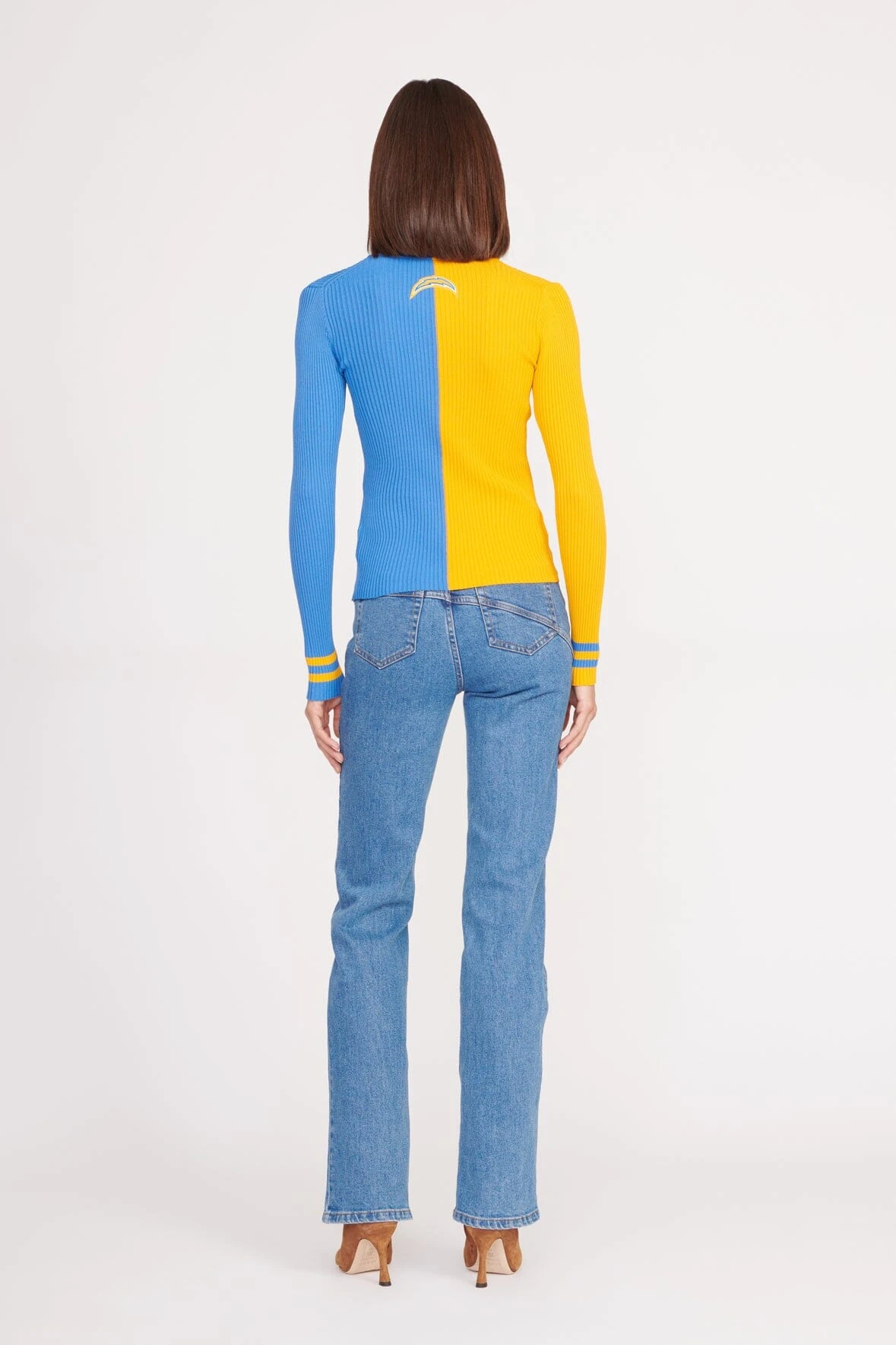 Our favorite cardigan, the Cargo Sweater, is updated to support your favorite NFL teams. The NFL STAUD Cargo Sweater is made out of our stretchy, comfortable compact rib knit fabric, and can be worn buttoned or unbuttoned. This special capsule features our signature color blocked pattern and a NFL team logo on the back.