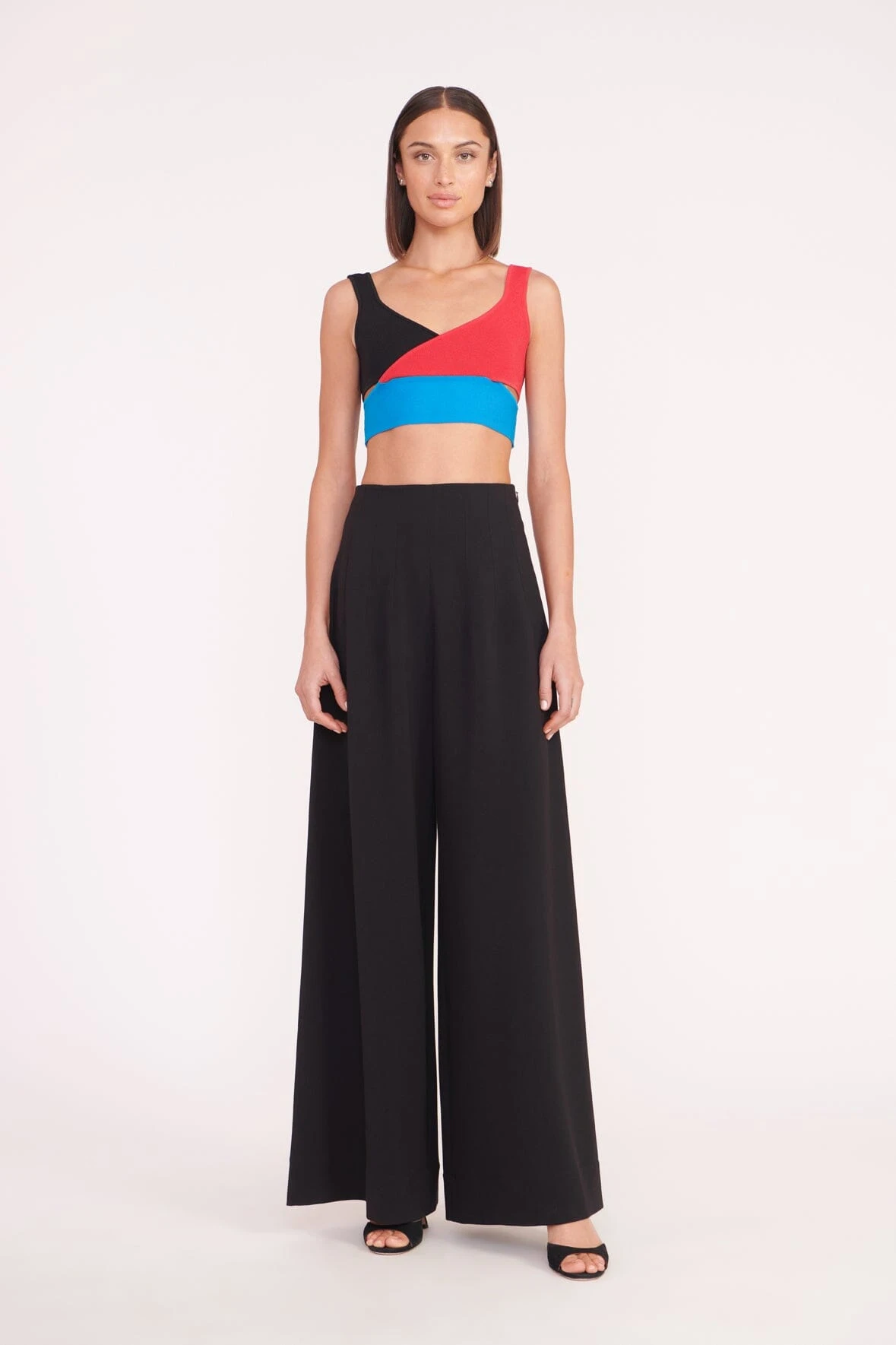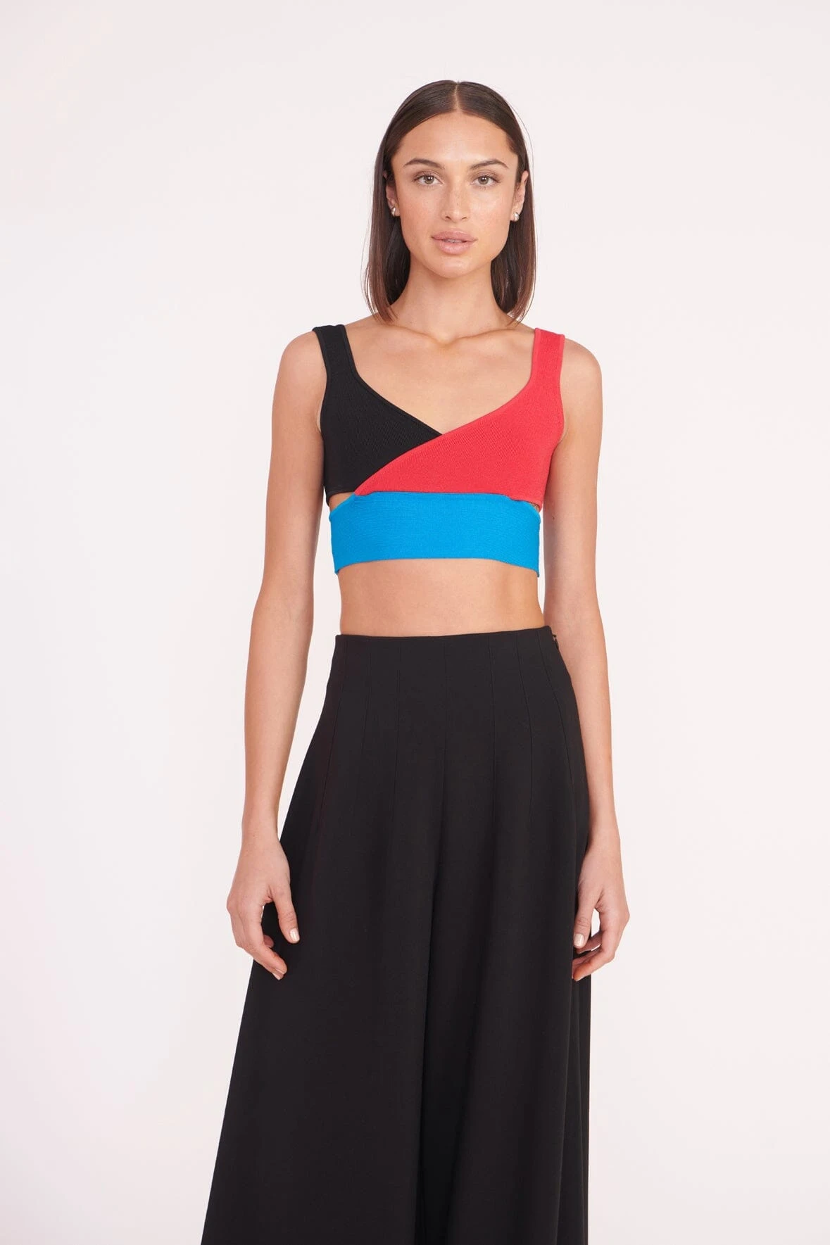 A color-blocked crop top made out of a stretchy compact knit fabric. The Trenton Top features a crossover bust panel detail and completes a set when worn with the matching Karina Skirt.