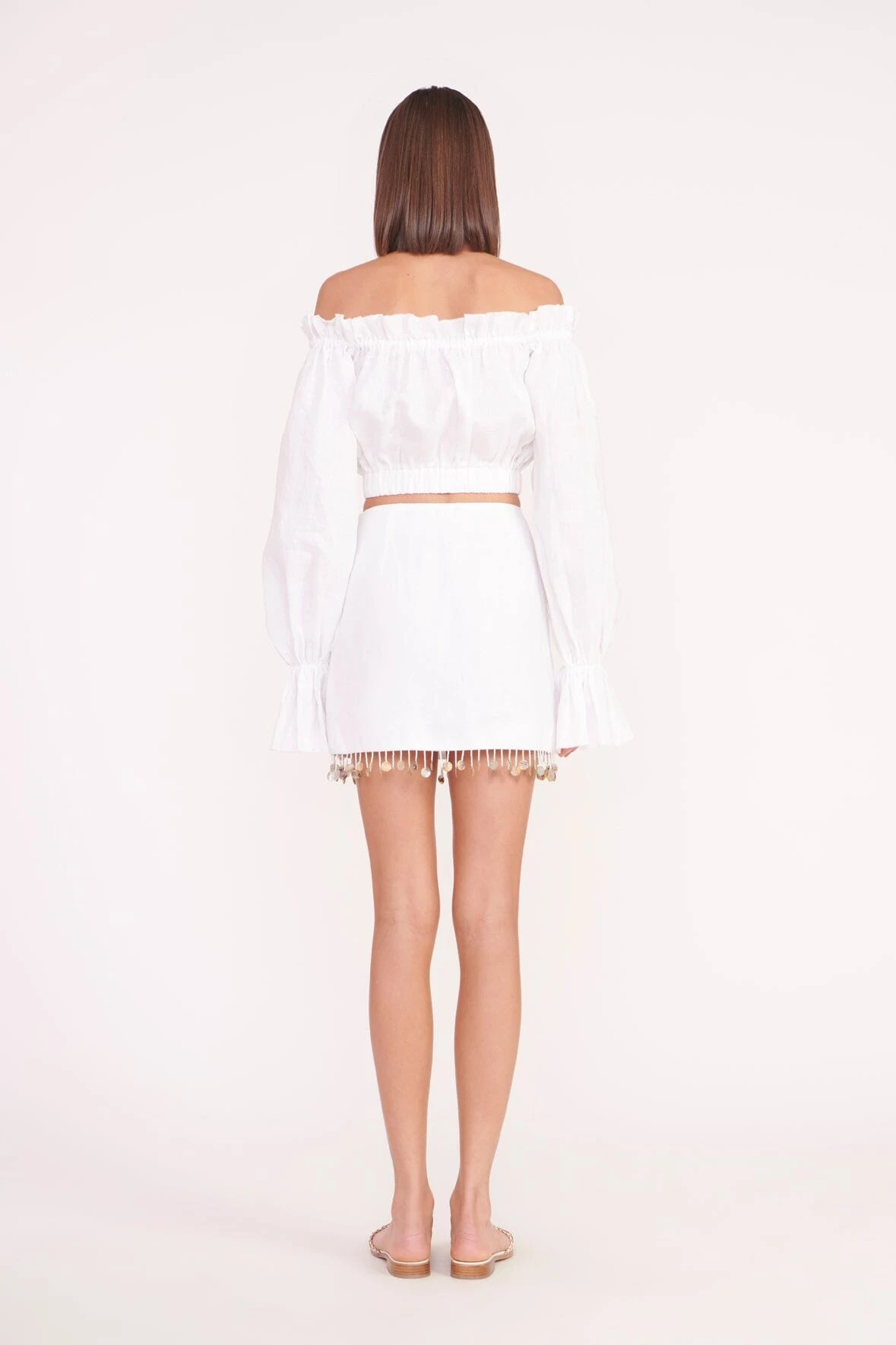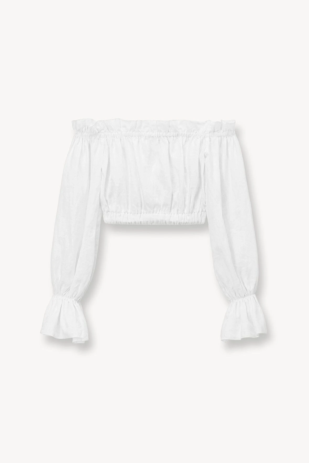 The Tristan Top is a cropped linen top, perfect for your Summer wardrobe. This top features an off the shoulder neckline, with ruffles at the neckline and cuff, with an elastic hem.ย