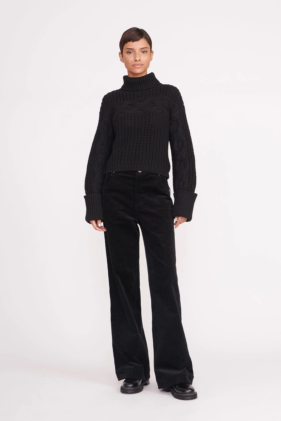 A chunky knit turtleneck with cropped, boxy fit. The Vernacular Sweater features a honeycomb cable stitch detail and oversized cuffs.