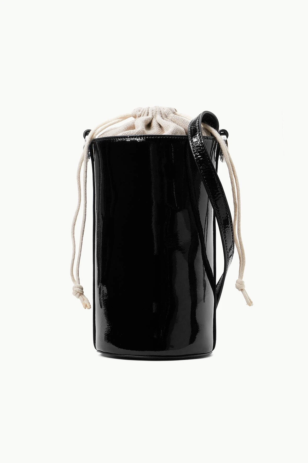 Adjustable patent leather bag with drawstring canvas lining fits up to one standard 1.5 L water bottle.Â