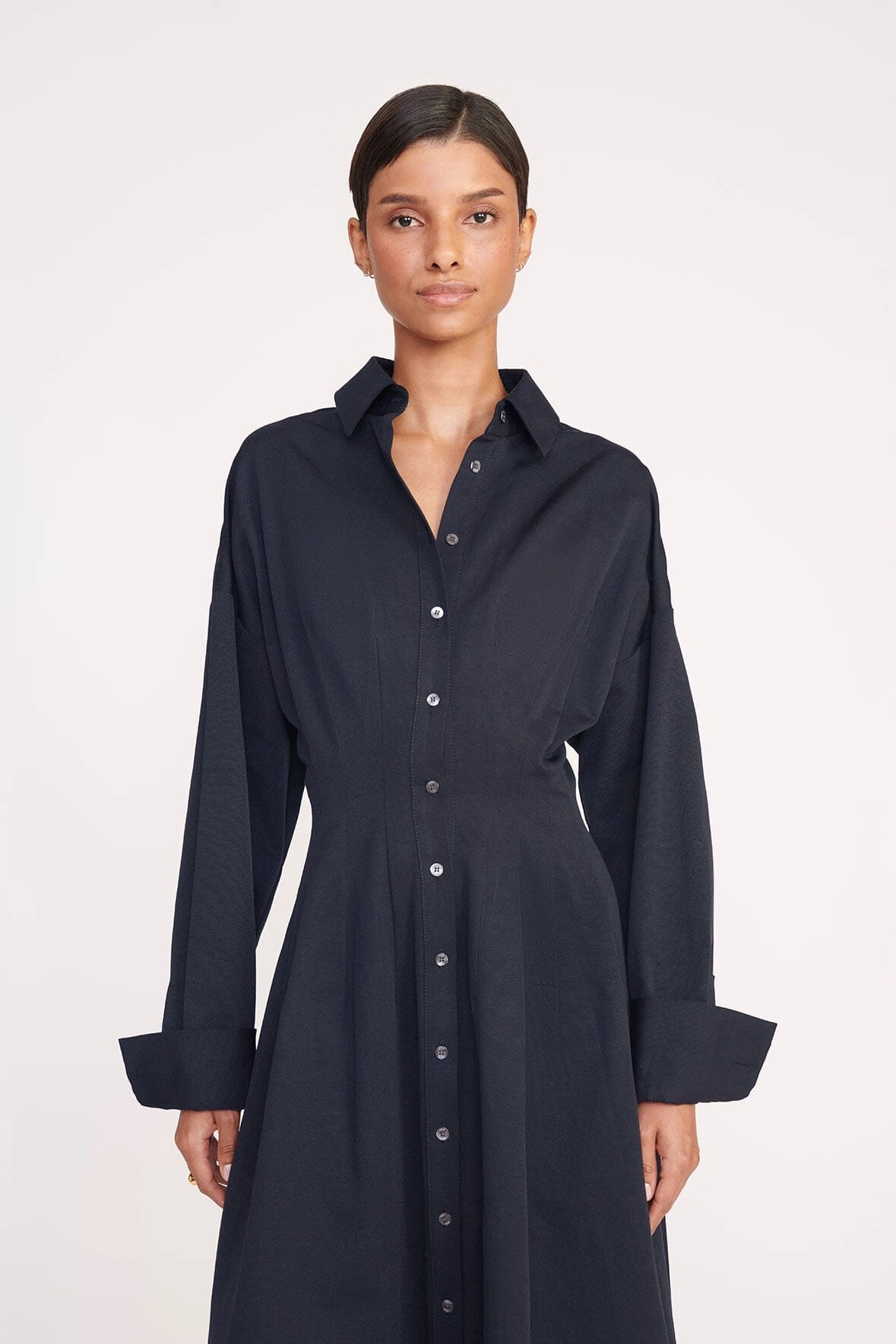 A chic button-up dress with a collar and oversized cuffs that can be worn buttoned or rolled up for an exaggerated look; The Winona Dress features a cinched waist with a comfortable elastic waistband at the back and is crafted in grosgrain.ย