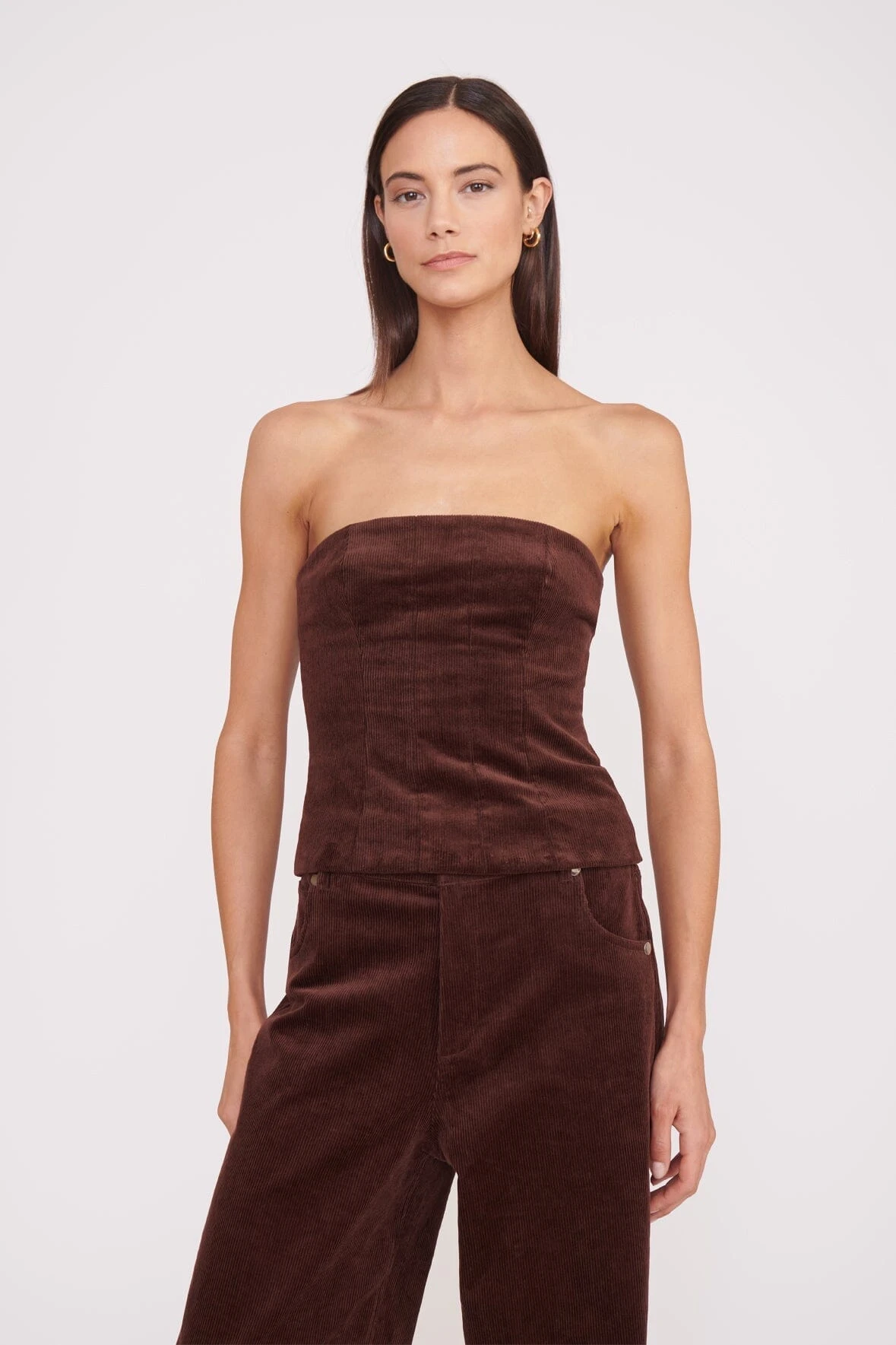 A fitted, strapless tube top with exposed back zipper. Updated in Corduroy, the Woodgrain Top the perfect Fall layering piece. Complete a coordinating set with the Grayson Pant.Â